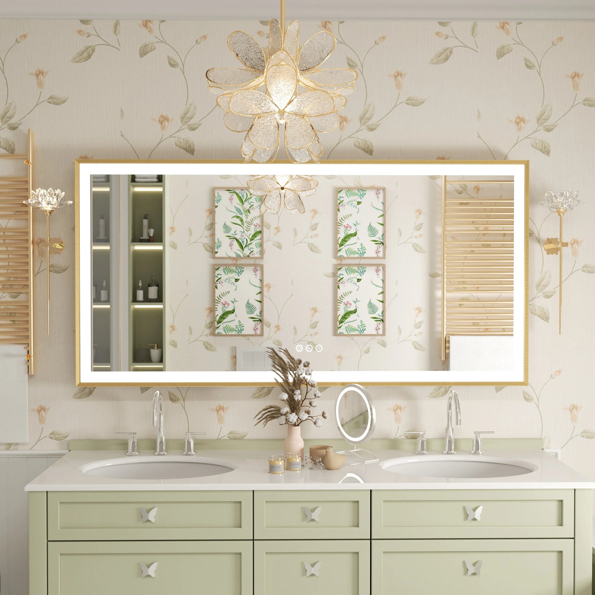 Brighten your daily routine with a luxurious LED bathroom mirror featuring a gold frame and front-lit illumination for flawless, makeup-ready lighting.